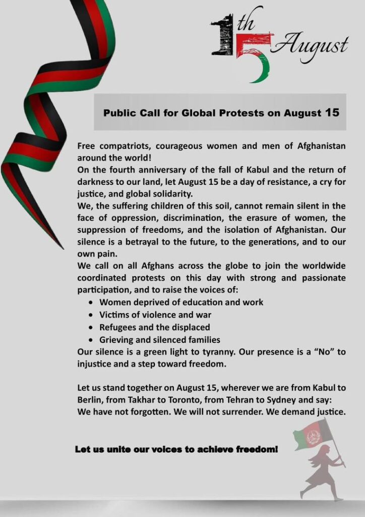 All Afghan citizens and human rights defenders around the world are invited to demonstrate on August 15 and express their opposition to legitimizing the Taliban.