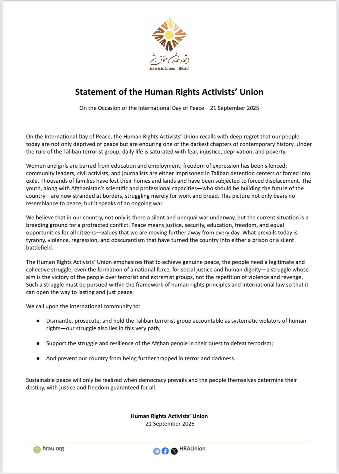 On the International Day of Peace, the Human Rights Activists’ Union recalls with deep regret that our people today are not only deprived of peace but are enduring one of the darkest chapters of contemporary history. Under the rule of the Taliban terrorist group, daily life is saturated with fear, injustice, deprivation, and poverty.