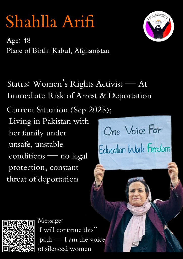 Current Situation (September 2025): Shahlla now lives in Pakistan with her eight-member family under extremely harsh and unstable conditions. She faces the constant threat of deportation back to Afghanistan, with no access to reliable legal, security, or financial support.